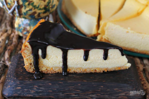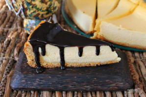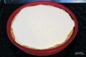Достаем заготовку из духовки и наполняем творожной массой. Выпекаем при температуре 170 градусов около 30 минут. Затем выключаем духовку, но дверцу не открываем, оставляем чизкейк в духовке еще на 30 минут.