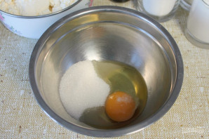 В миску насыпаем сахар (40 гр.) и добавляем яйцо. Взбиваем.