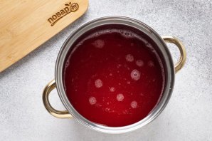 Залішкі бруснічнага жаму пераложыце ў кацёл, залейце вадой і на сярэднім агні давядзіце да кіпення.