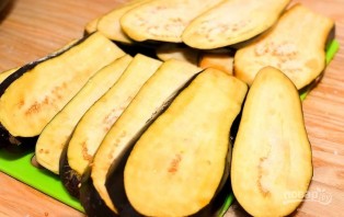 Баклажаны памыйце, нарэжце тоўстымі пласцінкамі ўздоўж. Пасаліце і апусціце ў пасалёную ваду, каб пайшла гарчызна.