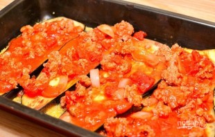 У фармочку на крошку пакладзіце падсмажаныя баклажаны, фарш з томатным соусам, паліце соусам «Бешамель», пасыпце сырам «Фета».