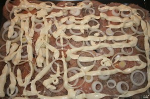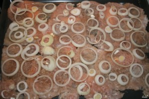 Мяса пасаліце і папярчыце па смаку, зверху пакладзіце кальцы луку.