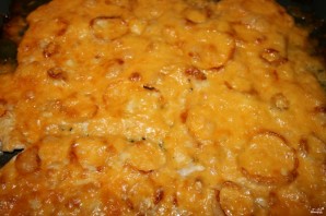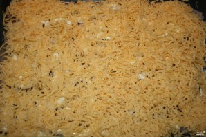Сыр натрыце на цёрцы, пасыпце ім страву зверху, каб утварыўся шчыльны сметанковы пласт. Разагрейце духоўку да 220 градусаў.