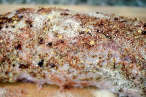 Мясо памыйце, абсушыце. Я выкарыстала мармурную ялавіну. Добра падыдзе і свініна, і тэляціна. Абсмажце мяса гарчыцай, пасаліце, абваляйце ў любімых спецыях.