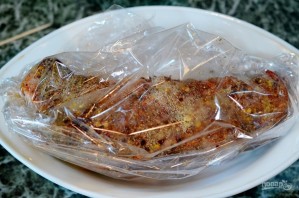 Пакладзіце ў рукав для запякання, зрабіце некалькі праколаў цыкоркамі. Пакладзіце ў форму для запякання.