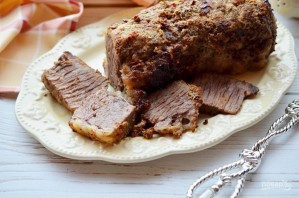 Сцяг не мае надмірнай складанасці. Для гэтага рэцэпту падыходзіць любое мяса: і свініна (асабліва добрым будзе вярхоўка ці грудзіна), у выніку атрымаецца хатняя бужэніна, буйволіна, тэляціна. Такое мяса — сапраўдны дэлікатэс і чудовая замена крамавым копчанасцям. Глядзіце, гатовы страву можна падаваць да стала.