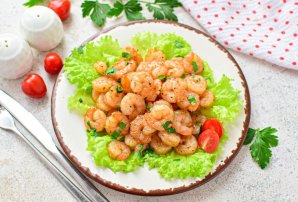 Рецепт не отнимет много времени. Для приготовления такого блюда можно брать креветки любого размера, в зависимости от того, как вы будете их подавать. Учитывайте, что при приготовлении креветки уменьшаются в размере Закуска готова. Подавайте сразу.