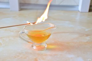 Горящим коньяком залейте креветки и дайте время выгореть алкоголю. Спирт уйдет, а аромат останется. С огнём будьте осторожны! При попытке шевеления сковороды появляются искры огня!