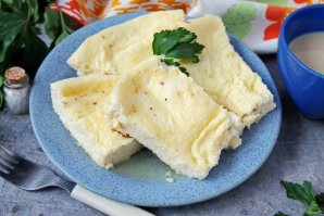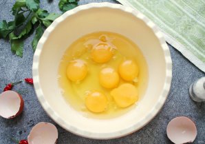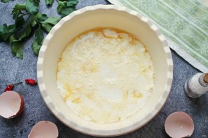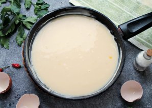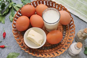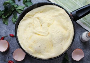 Блюдо готовится без лишних сложностей. Для того чтобы омлет получился пышным, продукты должны быть комнатной температуры. Не нужно сильно взбивать массу, достаточно просто перемешать венчиком до однородности. Яйца возьмите лучше всего свежие и чем насыщеннее желтки, тем ярче будет омлет Готовое блюдо можно подавать к столу.