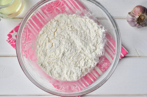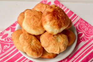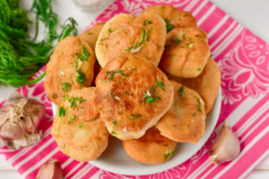 Выпечка готовится просто и быстро. Замесите из указанных ингредиентов тесто, оставьте его на 40 минут. Затем обомните тесто, сформируйте пампушки и жарьте их на разогретой с маслом сковороде. Готовые пампушки смажьте чесночно-укропным соусом и подавайте к столу Подавайте остывшим или слегка тёплым.