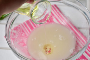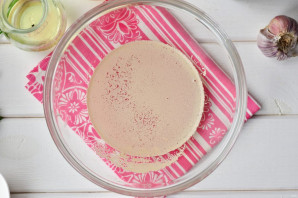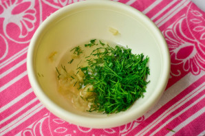 Чеснок выдавите в миску, добавьте измельченный укроп, влейте 20 мл. растительного масла, перемешайте.