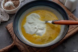 Добавьте сметану, перемешайте. Вместо сметаны можно добавить натуральный йогурт или кефир.