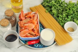 Подготовьте указанные ингредиенты. Молоко используйте кокосовое, но его можно заменить соевым, миндальным и т.д. Креветки залейте кипятком на 5 минут, если они розовые. Если креветки серого цвета, то проварите их 3-5 минут. Затем очистите от панцирей.