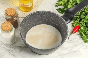 Влейте в ковш, казан или в кастрюлю с антипригарным дном кокосовое молоко, соевый соус и горячую воду. Всыпьте соль и молотый перец, доведите практически до кипения на плите.