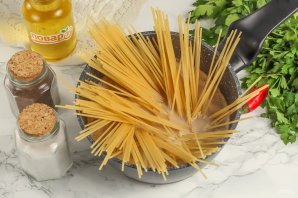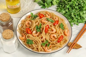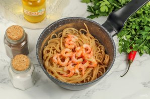 Когда спагетти будут практически готовы, добавьте в емкость очищенные креветки. Протомите еще 1-2 минуты, перемешав содержимое емкости.