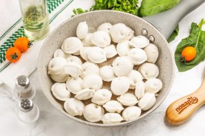 Прогрейте в сковороде растительное масло и выложите в нее замороженные пельмени. Заранее их размораживать не нужно!