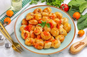 Промойте томаты и нарежьте кубиками, вырезая зеленые сердцевинки. Когда пельмени отлично прожарятся со всех сторон, добавьте нарезку помидоров в сковороду. Всыпьте соль и молотый черный перец. По желанию можете добавить и сушеный базилик, орегано и т.д. Аккуратно перемешайте и томите на среднем нагреве 3-4 минуты под крышкой.