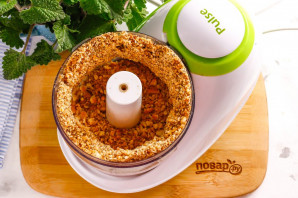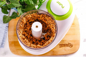 Ядра грецких орехов высыпьте в чашу блендера, измельчите практически в крошку примерно 3-5 минут.