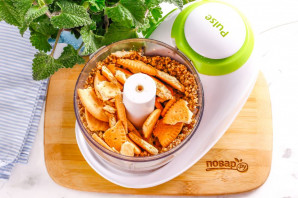 Разломите печенье на несколько частей, добавьте в емкость к ореховой крошке.