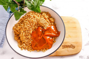 Пересыпьте приготовленную крошку в глубокую емкость, выложите туда же вареное сгущенное молоко. Аккуратно все перемешайте и оставьте на 20 минут, чтобы крошка печенья слегка разбухла.
