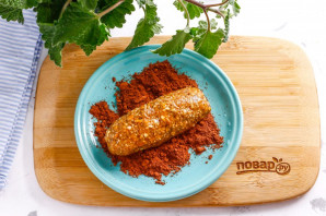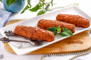 Высыпьте на блюдце какао-порошок, смочите руки в воде и сформируйте небольшую колбаску из сладкой массы. Обпанируйте ее в какао-порошке со всех сторон.