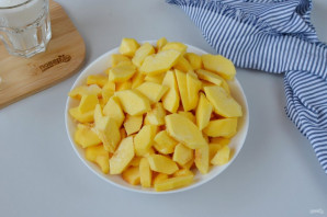 Вымойте тщательно плоды. Снимите кожуру, удалите сердцевинки. Порежьте небольшими кусочками айву.