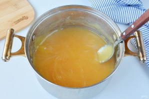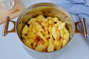 В маленькую кастрюльку выложите очистки, добавьте стакан воды и проварите 10-15 минут под крышкой. Именно в кожуре и сердцевине содержится наибольшее количество пектина.
