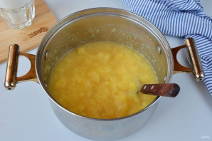 Доведите до кипения айвовое пюре и уваривайте до желаемой консистенции. Я варила 15 минут без крышки. Периодически перемешивайте, чтобы повидло не пригорало.