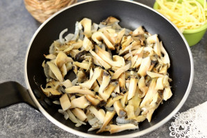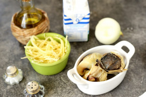 Разагрэйце на патэльні крыху рафінаванага расліннага алею, выкладзіце ў яго нацёрты паўкольцамі цыбулю, пасмажце некалькі хвілін да мяккага стану.