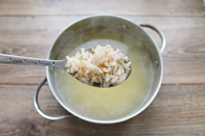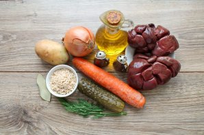 Прыгатуйце ўсе патрэбныя інгрыдыенты для прыгатавання рассольніка з ялавічымі пачкамі. Ячмень замочце на нач у цёплай вадзе, каб ён хутчэй зварыўся.