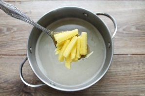 У чыстую кастрылю наліце мясны ці курны бульён і давядзіце яго да кіпення на сярэднім агні. Бульбу пачысціце і нарэжце саломкай, дадайце ў бульён.