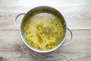 Дадайце ў бульён з бульбай адвараную перлавую крупу, пасаліце і варыце ўсё працягам 10 хвілін.