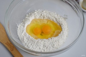 Просейце мукі ў міску ці на стол. Зрабіце углыбленне, пакладзіце яйкі, соль і лыжку масла.