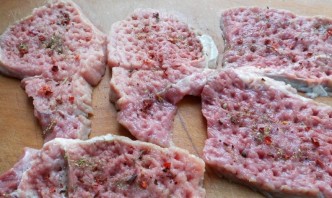 Ялавічыну нарэзаць шматкамі, адбіць молатком, пасаліць, паперчыць, пасыпаць спецыямі і папрыкай.