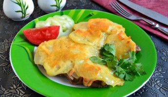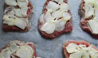 Выкладзіце мясо на падлошку, змазаную раслінным алеем. Мясо змажце сметанай ці майонезам, зверху пакладзіце цыбулю, нарэзаную тонкімі паўкалячкамі ці кальцамі.