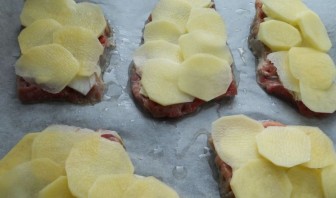 На лук выкладваем тонкія кружочкі бульбі ўнахлёст (папярэзаць тонка, як на чыпсы).