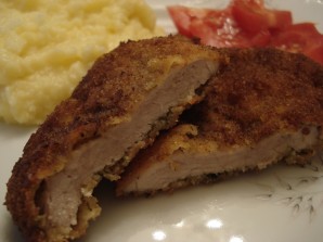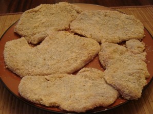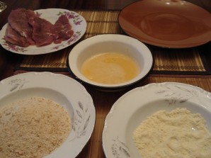 Кожны шматак апусціце спачатку ў муку, потым у яйка, а затым — у сухары.