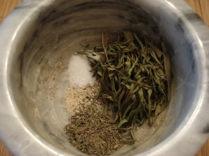 Зеляніну дробязна нарэжце разам з сольлю. Пасаліце і натрэце спецыямі мяса.