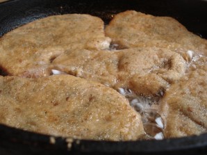 Абсмажваем па хвіліне з кожнага боку тры разы — усяго 6 хвілін. Патэльня павінна быць разагрэтай, з невялікай колькасцю алею.
