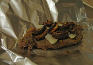Пасмажылі мясо на разагрэтай скавародзе ў алеі. Дадалі крыху вады, гарчыцу і соус. Потым выклалі ў фольгу, зверху паклалі пару кольцаў луку.