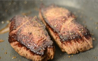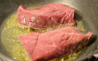 1. Мяса ачышчаем ад плёнак, на вялікім агні падсмажваем да з'яўлення залатой карочкі.