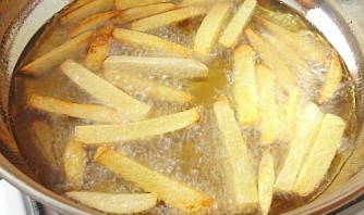 3. Пакуль мяса дасягае патрэбнай вам ступені паджарвання, падгрэем алею для фрытюра. Асмажваем бульбу. Соль — па смаку.