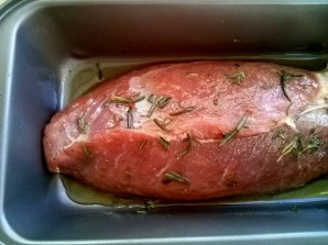 4. Намажце сметанкай з прыправамі. Потым пераложыце ў форма для выпечкі і пастаўце ў разагрэтую да 230 °C духоўку на 15 хвілін. Потым панізьце тэмпературу да 150 °C і дапякайце мяса, разлічваючы: 15-20 хвілін на кожныя 500 г для сярэдняй ступені прагатоўвання і 40-45 хвілін — для поўнай.