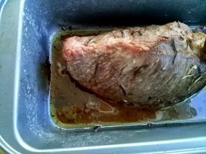 5. Падчас запякання трэба паліваць мяса вылучаючымся сокам. Таксама важна кантраляваць тэмпературу ўнутры кавалка. Калі вы не з'яўляецеся шчаслівым уладальнікам тэрмометра для мяса, то тэмпературу можна вызначыць з дапамогай цыкоркі. Проста ўставіце цыкорку ў цэнтр кавалка мяса, і колер вылучанага соку пакажа ступень прагатоўвання мяса: чырвоны – з крывёй (rare), ружовы – сярэдняй ступені прагатоўвання (medium), празрысты – поўнае прагатоўванне (well done).
