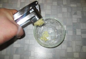 1. Чтобы лаваш не был сухим, а закуска получилась пикантной, пропустите через пресс чеснок.