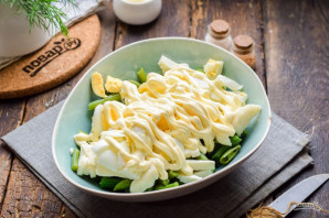Курыныя яйкі зварыце ўвасклую 10 хвілін у пасоланай вадзе. Пасля яйкі ахалодзьце і ачысьціце, нарэжце кубікамі і дадайце ў салат.