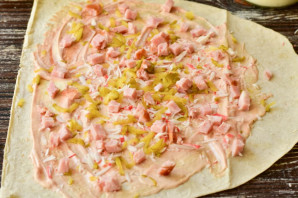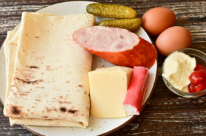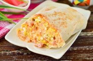 Идеально к столу и к напиткам. Для приготовления такой шаурмы стоит использовать качественную ветчину, твердый сыр и крабовые палочки. Можно некоторые составляющие заменить. К примеру, вместо соленого огурца добавить свежий помидор или капусту. Вместо кетчупа взять томатную пасту Подавайте с зеленью и соусом.