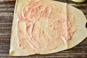 Разрежьте лаваш пополам. Смажьте майонезом и кетчупом.