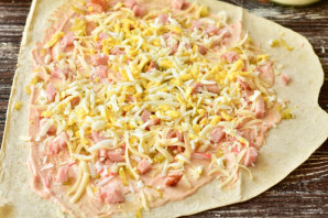 Выложите нарезанную кубиками ветчину и тертый твердый сыр.