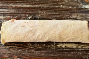 Скрутите шаурму в рулет. Обжарьте ее буквально 1 минуту на сухой сковороде.